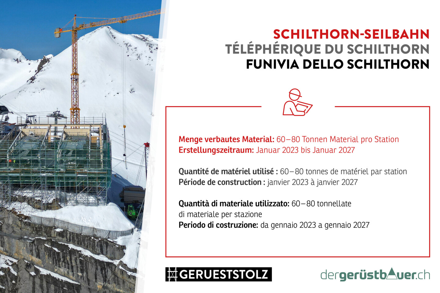 Bis 2026 entsteht mit dem Projekt «Schilthornbahn20XX» eine neue Seilbahn zwischen Stechelberg und Piz Gloria. Neben Gerüsten an Tal-, Zwischen- und Gipfelstationen wurden auch Stütz- und Flächengerüste für Deckenschalungen gestellt. Dabei sind die Gerüstbauer extremen Bedingungen ausgesetzt, die von den schwierigen Wetterverhältnissen über die Höhenlage bis hin zu den Herausforderungen bei der Materiallogistik reichen.